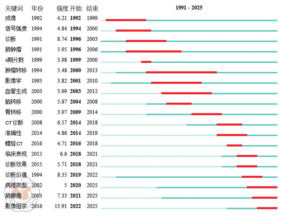 Results A total of 1 588 articles were eventually included. The annual publication volume showed an overall upward trend, peaking in 2019 with 111 articles. Among them, the second Affiliated Hospital of Naval Medical University (Shanghai Changzheng Hospital) was the institution with the highest domestic publication output (34 articles). High-yield authors demonstrated collaborative relationships and formed their own stable research teams, yet cross-team collaborations remained limited. In terms of institutional collaboration, both intra-institutional and cross-institutional cooperation existed, but collaborations among top-tier institutions were relatively scarce. Keyword analysis indicated that in recent years, the research focus of MRI in lung cancer had gradually evolved from functional imaging such as diffusion-weighted imaging to pathological types and radiomics.